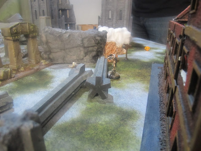 Alan decided he didn't want me having the ability to shoot him so he cast another fog. My assault group have made it to the central building. In the background I can see Edwards henchman trying to get one of the treasures. Teddy is now fighting Edwards construct and is quite near the central treasure.