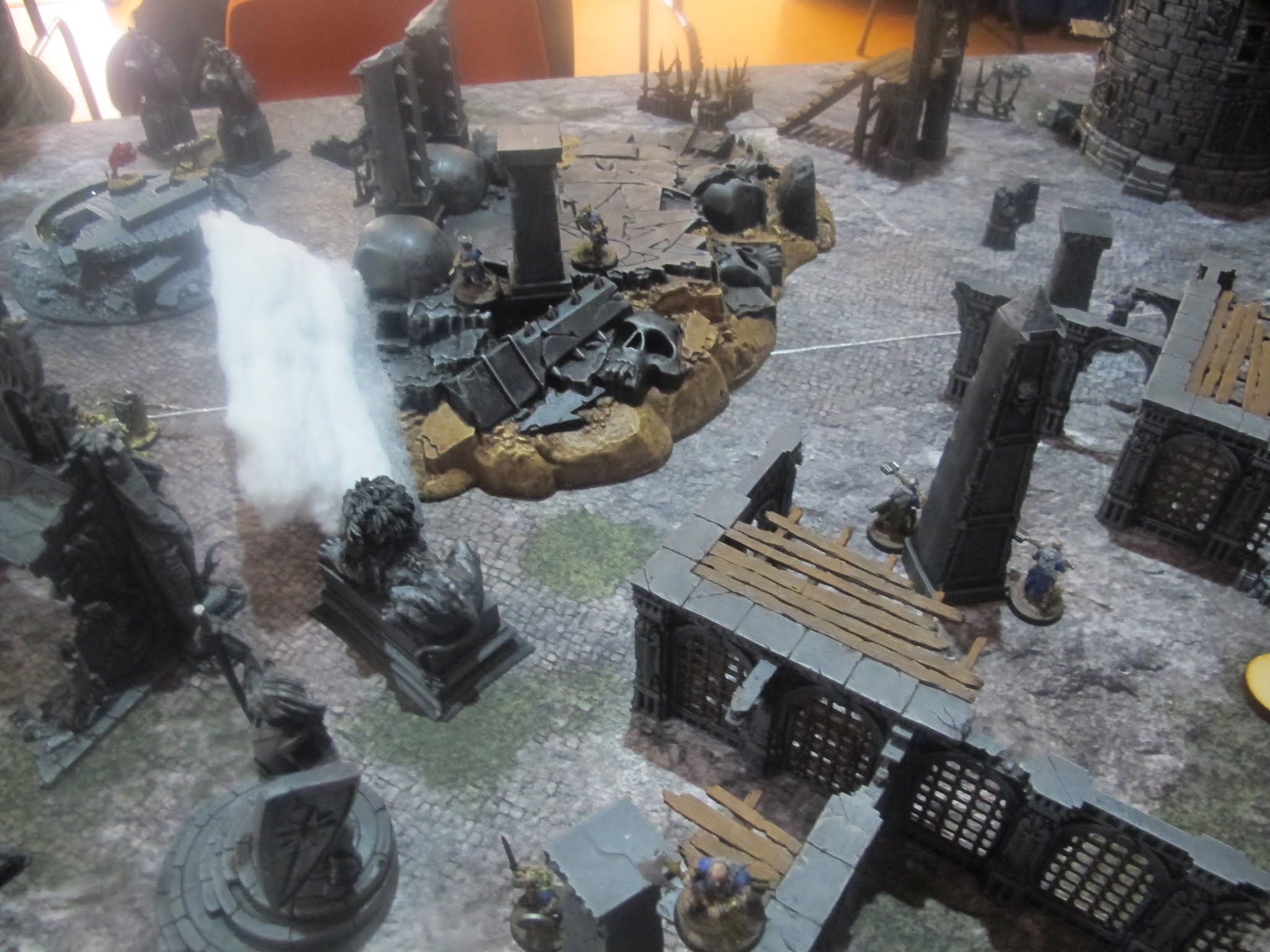 Advancing between tow ruined towers we spied the dimensional anchors guarded by blood marked Berserkers.Thomas and his elementalist warband plan of blowing up the pillars with fire.